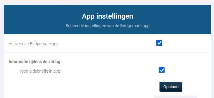 - Scroll terug naar de bovenkant van de pagina, schakel Activeer de Bridgemate-app in en klik vervolgens op de blauwe knop Opslaan verder naar onderen.